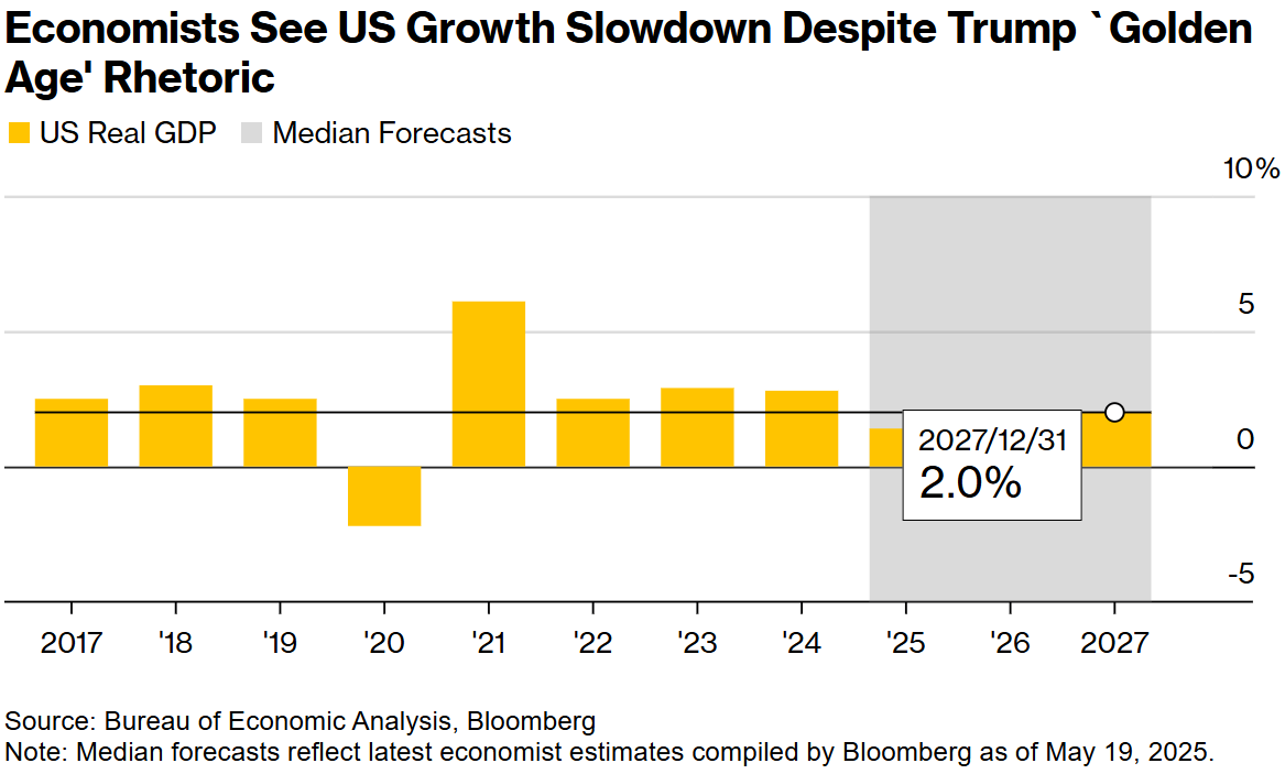 彭博最新汇编的经济学家预测中值显示,今年美国GDP增速预计为1.4%,2026年1.5%,2027年2%。相较之下,自2020年疫情冲击后,美国年度增长率从未低于2.5%。