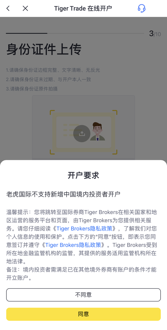 截至发稿,红星资本局在老虎国际APP看到,开户要求写着“不支持新增境内投资者开户”,要求开户客户提供“其他境外券商账户证明”,并承诺在其他境外券商账户开通时间在2023年5月19日之前。