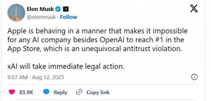 这位现已将Grok人工智能团队和X社交网络纳入本人创立的旗下xAI Holdings的亿万富翁创始人表示,苹果公司让除OpenAI之外的任何AI应用都不可能登顶App Store排行榜榜首——这是AI应用开发者们梦寐以求的全球市场聚光灯。在他本人X账号上(前身为推特)的一则置顶帖子中,马斯克向苹果管理层发出质问:苹果不突出他的AI应用产品是否在“玩政治”,并表示xAI将立即采取法律行动。